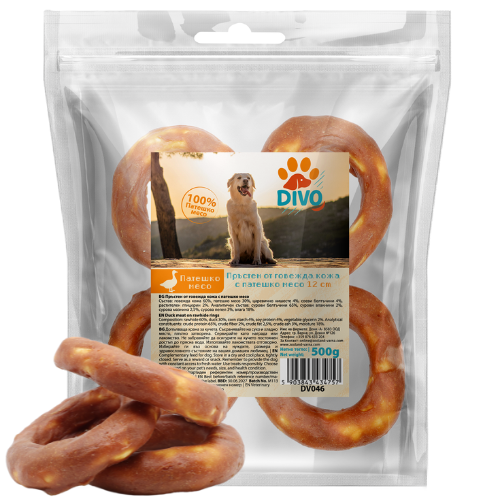DIVO пръстени от говежда кожа с патешко месо 12 см – 500g са вкусни, дъвчащи и напълно натурални лакомства, подходящи за всички породи. Комбинират твърда говежда кожа и ароматно патешко месо за дълготрайно дъвчене, почистване на зъбите и поддържане на здрави венци.