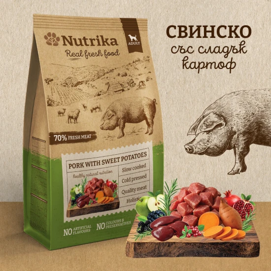 Nutrika Pork with Sweet Potato е висококачествена полувлажна храна за кучета, създадена по иновативна технология на бавно готвене, студено пресоване и деликатна дехидратация. Формулата е разработена за израснали кучета от всички породи и осигурява пълноценен, балансиран и натурален хранителен режим.