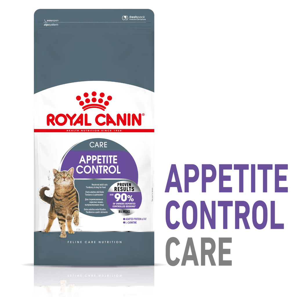 ROYAL CANIN® Appetite Control Care е суха храна на гранули, специално създадена за кастрирани котки, която помага за контролиране поведението на просене и за ограничаване натрупването на излишно тегло. ROYAL CANIN® Appetite Control Care съдържа специфичен микс от диетични фибри, за да помогне котката ви да се чувства заситена и удовлетворена след хранене, което намалява поведението на просене. За да съдейства за ограничаване на риска от натрупване на излишно тегло, ROYAL CANIN® Appetite Control Care е формулирана с умерено съдържание на мазнини и енергийно съдържание, така че котката ви да остане в добра форма. Резултатите от храненето с ROYAL CANIN® Appetite Control Care са научно доказани. Резултатите от вътрешно проучване на Роял Канин сочат, че повече от 90% от участващите собственици на домашни любимци споделят, че поведението на просене при котката им е овладяно след само 4 седмици хранене с ROYAL CANIN® Appetite Control! За да задоволи апетита на всяка котка, ROYAL CANIN® Appetite Control е налична още и под формата на суха храна на гранули. Ако котката ви се радва на комбинирането на суха и мокра храна, следвайте внимателно препоръките за смесено хранене, описани на опаковката на продуктите.